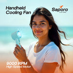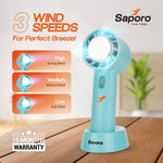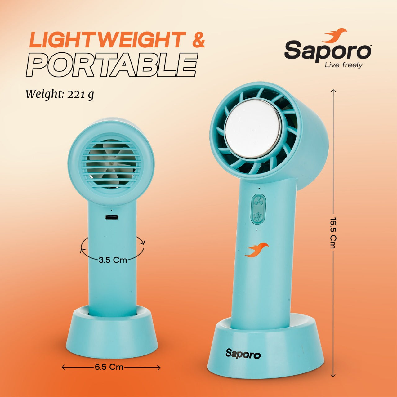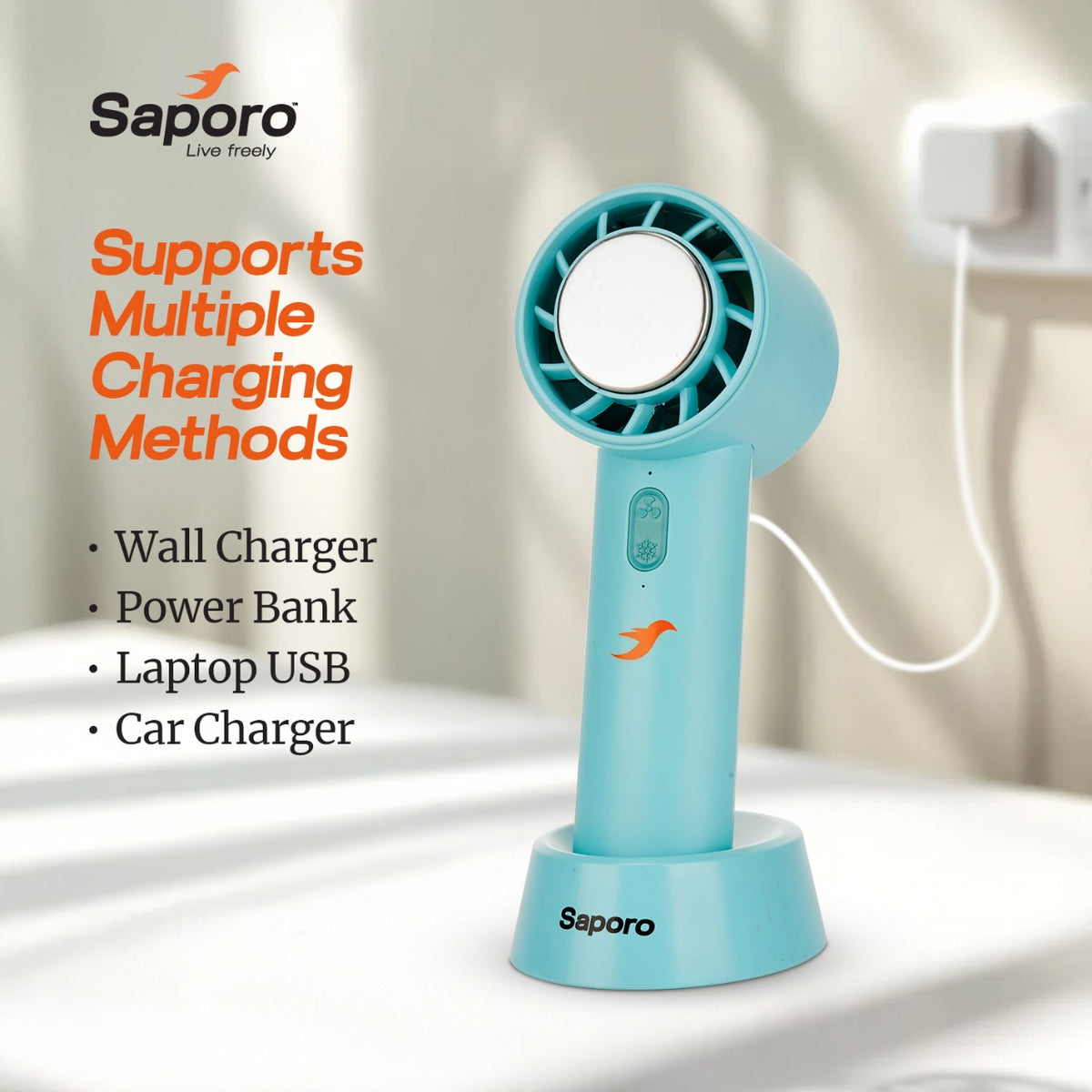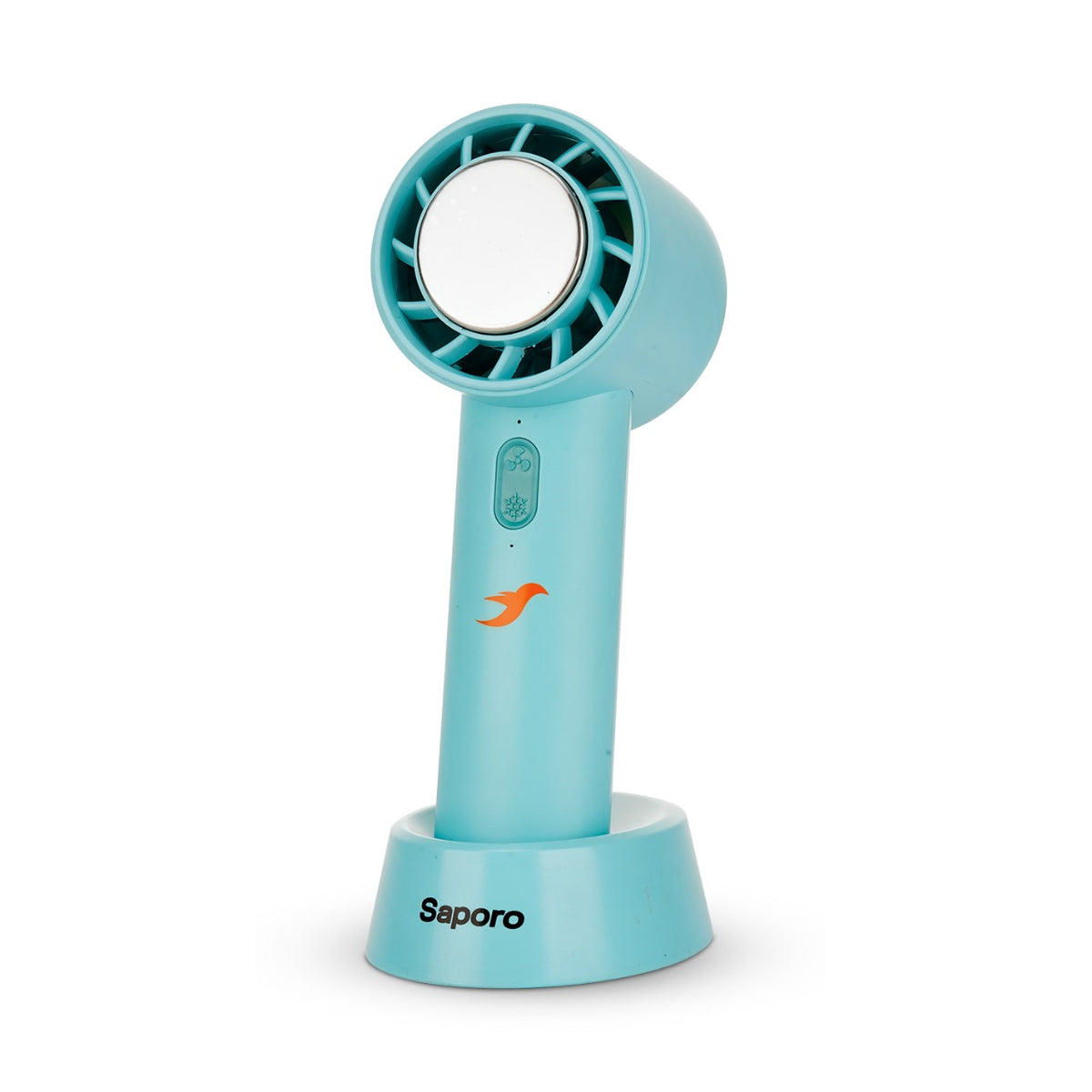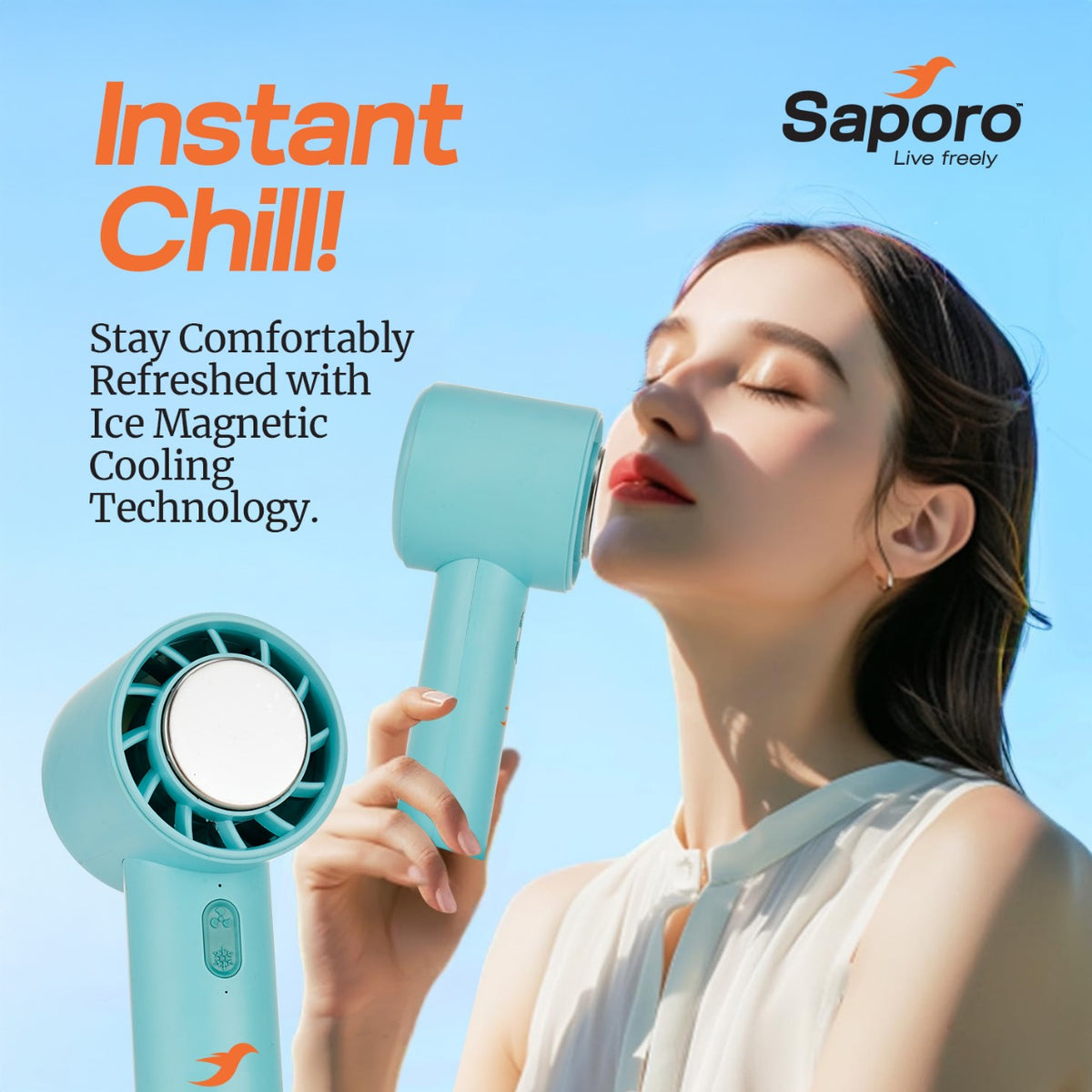 The Saporo ChilMate Mini Cooling Fan is designed to deliver powerful, refreshing airflow wherever you go. Compact, handheld, and rechargeable, it features 3 adjustable speed levels with turbo airflow reaching up to 9000 RPM for instant cooling relief. Equipped with an innovative ice cooling plate, it enhances the cooling sensation, making it perfect for home use, makeup application, travel, or outdoor adventures. Lightweight and stylish in a vibrant blue color, the Saporo ChilMate Mini Fan offers a perfect blend of performance and portability to keep you cool anytime, anywhere.