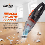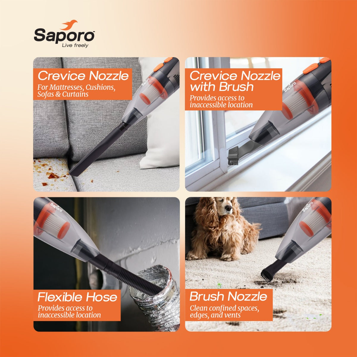 Ans: The Saporo PureVac comes with 4 attachments, including a flexible hose pipe, crevice tool, and two brush heads—perfect for reaching tight spaces and cleaning various surfaces with ease.